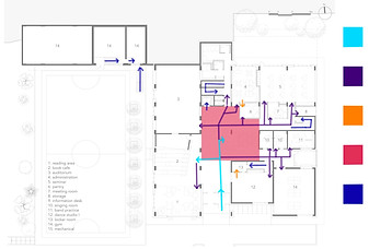 The primary paths of travel mainly exist in the main hallways, allowing the secondary circulation to show different ways to come off of the path for specific room needs, and tertiary paths are less common paths used, typically coming off of the secondary paths.